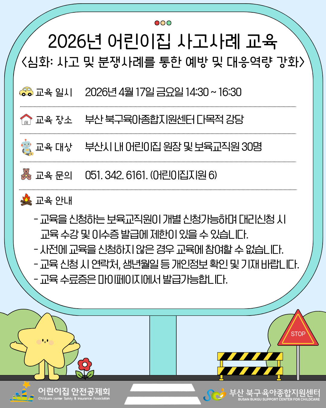| ±âŸ»çÇ× | - º»ÀÎ È®ÀÎÀ» À§ÇØ ½ÅºÐÁõÀ» ²À ÁöÂüÇÏ½Ã±æ ¹Ù¶ø´Ï´Ù. - ±³À°À» ½ÅûÇÏ´Â º¸À°±³Á÷¿øÀÌ °³º° ½Åû°¡´ÉÇÏ¸ç ´ë¸®½Åû ½Ã ±³À° ¼ö° ¹× À̼öÁõ ¹ß±Þ¿¡ Á¦ÇÑÀÌ ÀÖÀ» ¼ö ÀÖ½À´Ï´Ù. - »çÀü¿¡ ±³À°À» ½ÅûÇÏÁö ¾ÊÀº °æ¿ì ±³À°¿¡ Âü¿©ÇÒ ¼ö ¾ø½À´Ï´Ù. - ±³À° ½Åû ½Ã ¿¬¶ôó, »ý³â¿ùÀÏ µî °³ÀÎÁ¤º¸ È®ÀÎ ¹× ±âÀç ¹Ù¶ø´Ï´Ù. - °ÀÇ ½ÃÀÛ 10ºÐÀü±îÁö ÀÔ½Ç ¿Ï·á ¹Ù¶ó¸ç, °ÀÇ ½ÃÀÛ 20ºÐ ÈÄ ÀԽǰú Á¾·á Àü¿¡ Åð½ÇÇϽŠºÐ, ±³À° Áß ÀÚ¸®¸¦ 10ºÐ ÀÌ»ó ºñ¿ì½Å ºÐ µî ±³À° Âü¼®ÀÌ ºÒ¸íÈ®ÇϽŠºÐÀº ¼ö·áÁõ ¹ß±ÞÀÌ Á¦Çѵ˴ϴÙ. |